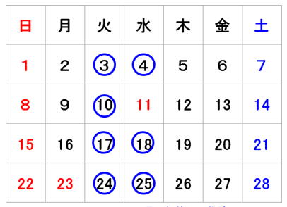 2月3,4,10,17,18,24日(終日)、25日(午後)