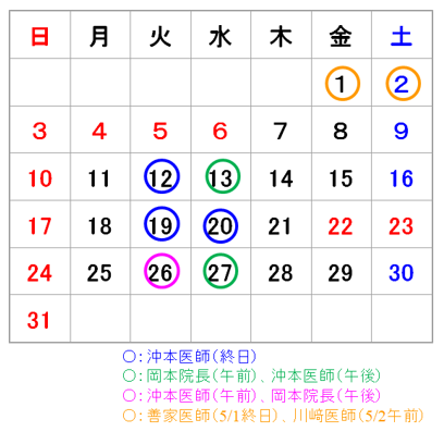 5月の岡本院長以外の診察のお知らせです