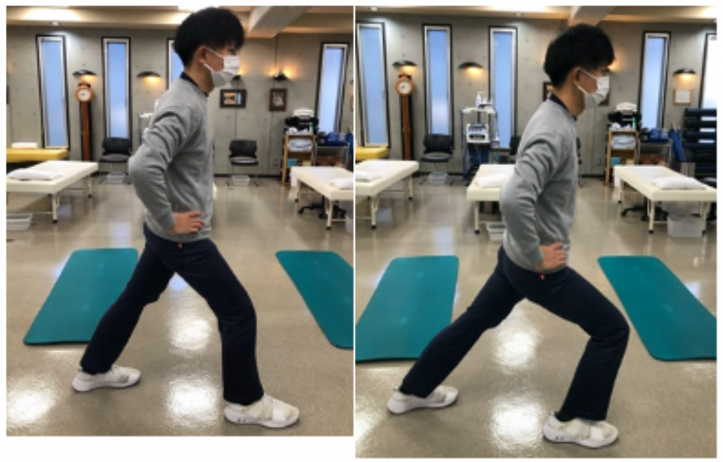 ②後ろの足の踵を床から離さないようにして、前に出した足に膝を曲げて体重を移動します。