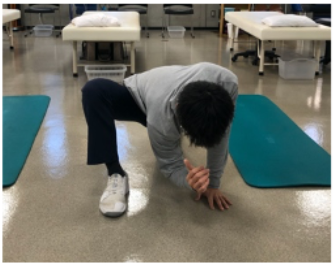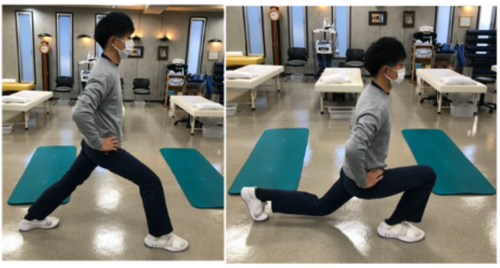 ①どちらか一方の足を前にだし、深く股関節を落とします。足と反対の手を床につきます。