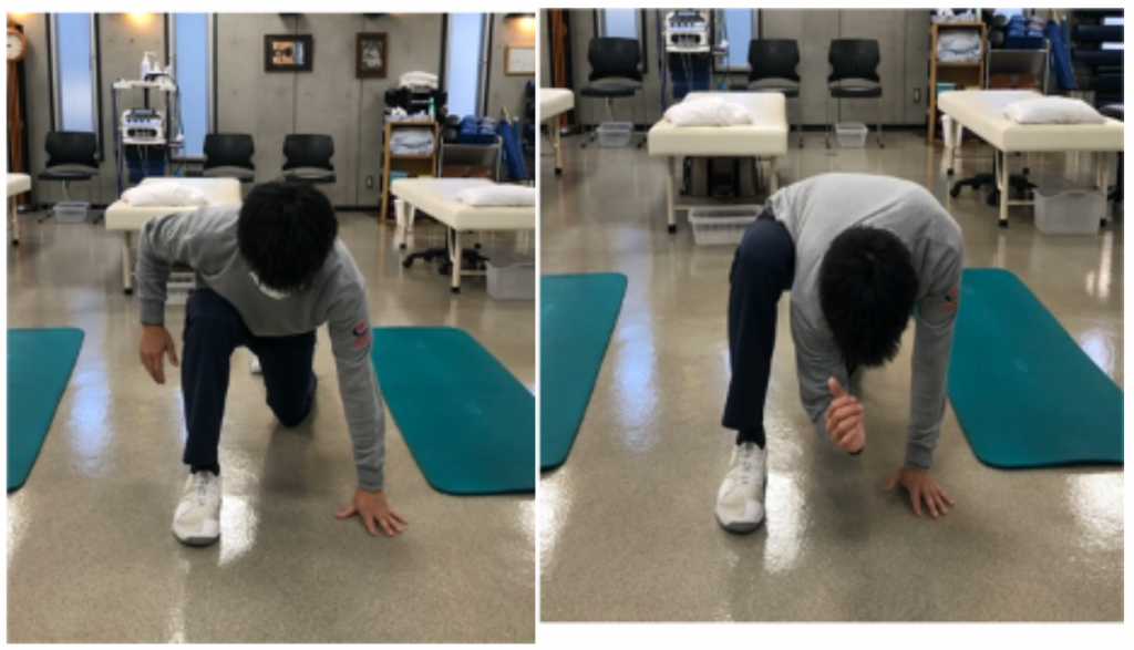④最後に、両手をつき前足を床についた状態で後方に体重を移動します。
