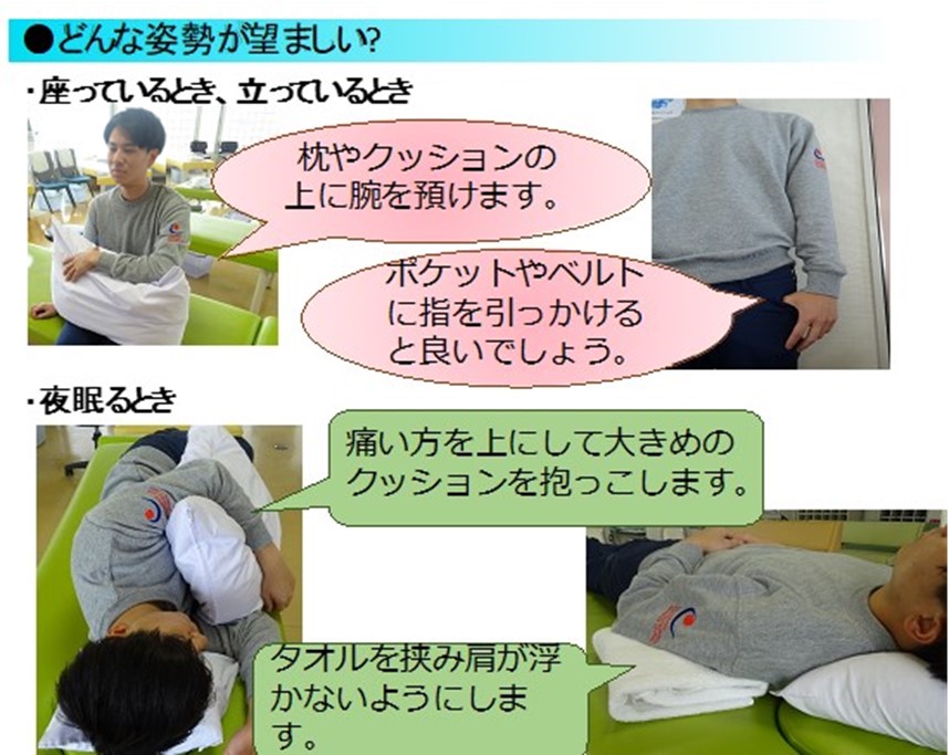 上の写真は、当院の「肩関節痛に対する生活指導」のパンフレットから抜粋したものです。