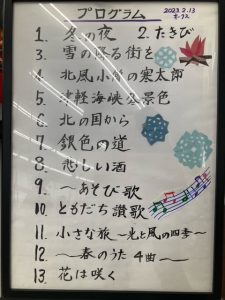 今回は、冬の歌が中心でしたが、お雛様も飾ってあるのと、春が待ち遠しいということで春の歌も演奏してくださいました。